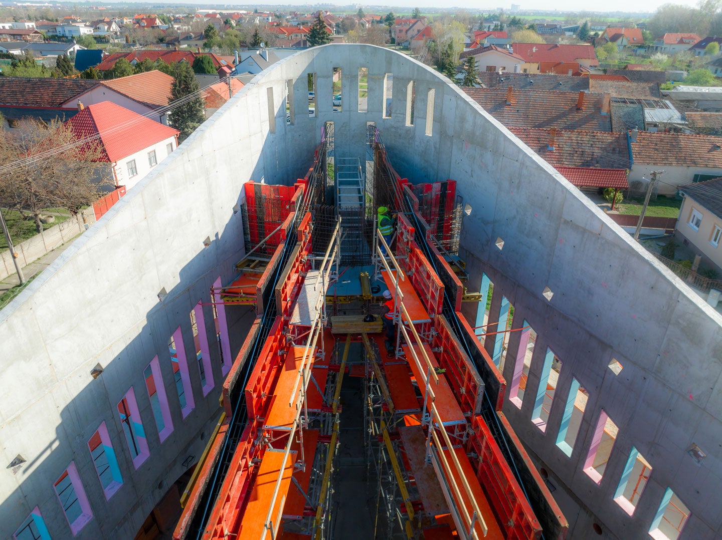 Ako stenové debnenie bolo použité systémové debnenie TRIO v kombinácii so systémom RUNDFLEX pre oblúkové steny.
